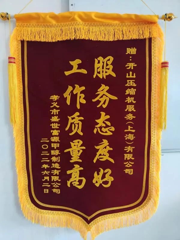2022年6月10日,山西孝義鵬飛集團(tuán)下屬公司--孝義市盛世富源甲醇制造有限公司舉辦了“優(yōu)秀供應(yīng)商”表彰活動(dòng)。在活動(dòng)中,孝義市盛世富源甲醇制造有限公司感謝開(kāi)山壓縮機(jī)服務(wù)(上海)有限公司,提供了“高標(biāo)準(zhǔn)、高質(zhì)量、高效率”的標(biāo)準(zhǔn)化例行檢修服務(wù),并授予“服務(wù)態(tài)度好、工作質(zhì)量高”的表彰錦旗。